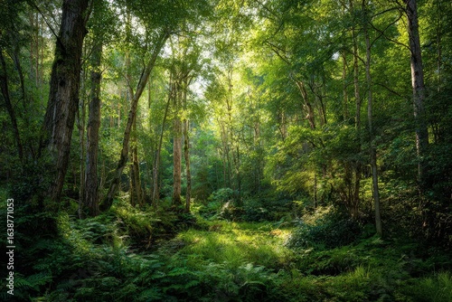© Sahal, Obraz premium Sunlight Filtering Through Lush Green Forest