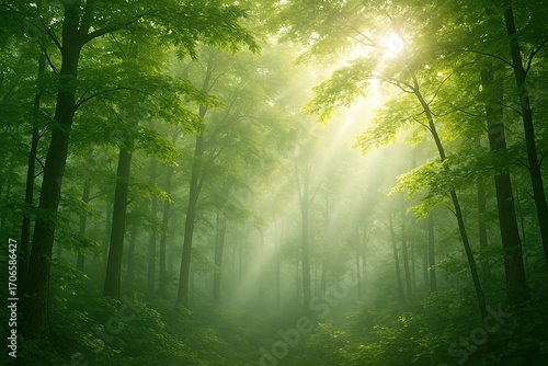 Obraz premium Sunlight filtering through lush green forest canopy creating an ethereal...