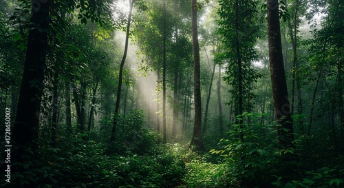 Fototapeta premium Sunlight filtering through lush green forest canopy creating ethereal light...