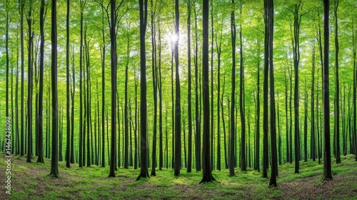 © Ratchanee, Obraz premium Sunlight Filtering Through Lush Green Forest Canopy in Spring