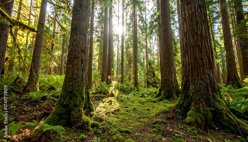 © yil, Fototapeta premium Sunlight Filtering Through Lush Green Forest Canopy Landscape