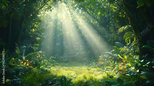 Obraz premium Sunlight filtering through lush green forest canopy serene nature scene...
