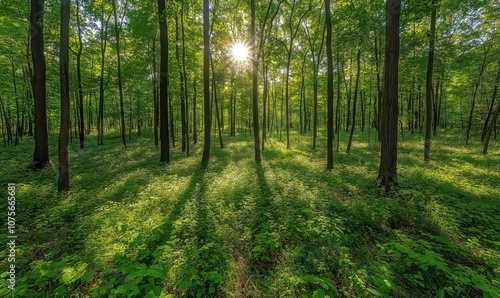 Fototapeta premium Sunlight filtering through lush green forest, tall trees casting shadows