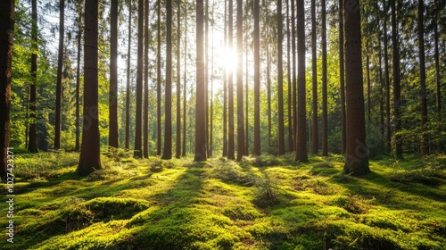 Obraz premium Sunlight Filtering Through Lush Green Forest Trees