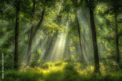 © inas, Obraz premium Sunlight filtering through lush green forest trees along a peaceful woodland path