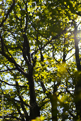 Obraz premium Sunlight filtering through lush green tree canopy in forest