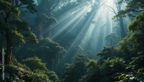 © Kitta Studio, Obraz premium Sunlight Filtering Through Lush Green Trees in Serene Forest Setting