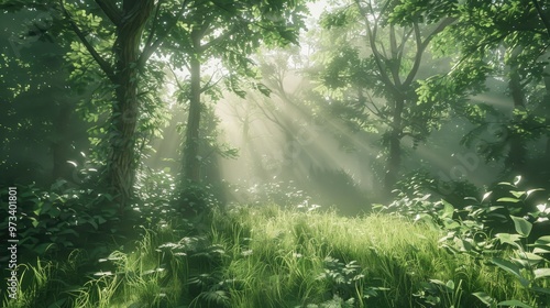 © CreativeBro, Fototapeta premium Sunlight filtering through lush green woodland