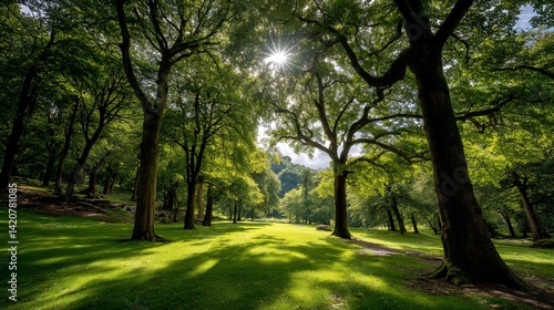 Fototapeta premium Sunlight filtering through lush trees in a park