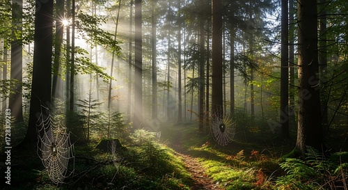 © ziyan, Obraz premium Sunlight Filtering Through Misty Forest.
