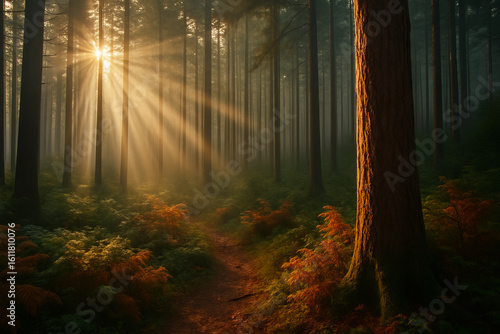 Fototapeta premium Sunlight filtering through misty forest trees, illuminating a quiet winding path in serene natural landscape.