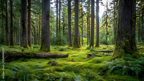 © pete99, Obraz premium Sunlight filtering through mossy forest floor