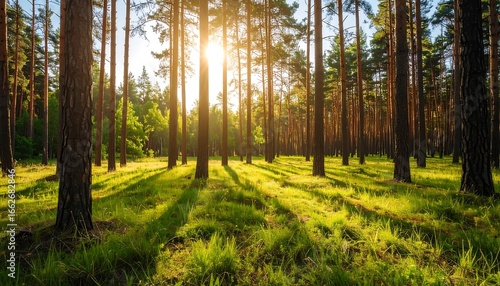 © Yung, Naklejka premium Sunlight filtering through pine trees (1)