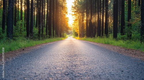 Obraz premium Sunlight filtering through pine trees onto a quiet forest road, tranquil and...