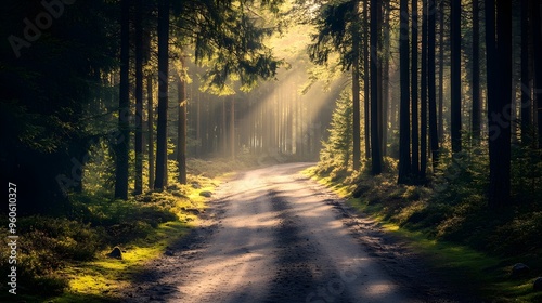 Naklejka premium Sunlight filtering through pine trees onto a quiet forest road, tranquil and...
