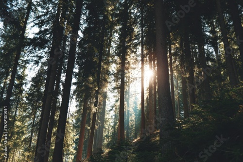 © sogap, Obraz premium Sunlight filtering through tall evergreen trees casting long shadows in a dense forest landscape during daytime