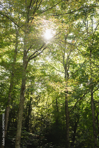 © Yuliya, Obraz premium Sunlight filtering through tall forest trees at Turkey Run State Park in Indiana