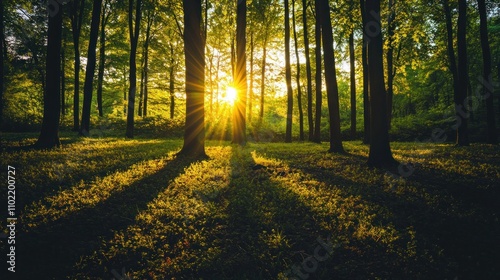 © stock.finder, Fototapeta premium Sunlight filtering through tall forest trees casting shadows on ground