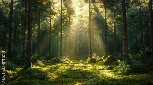 Fototapeta premium Sunlight filtering through tall trees in a dense forest illuminating a moss-covered forest floor with serene and peaceful atmosphere