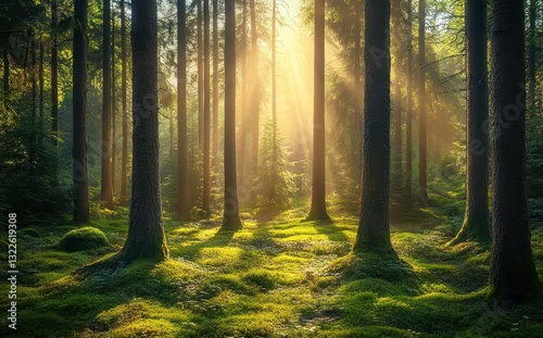 © ANUAR, Obraz premium Sunlight Filtering Through Tall Trees in a Lush Green Forest Creating a Tranquil and Serene Natural Environment