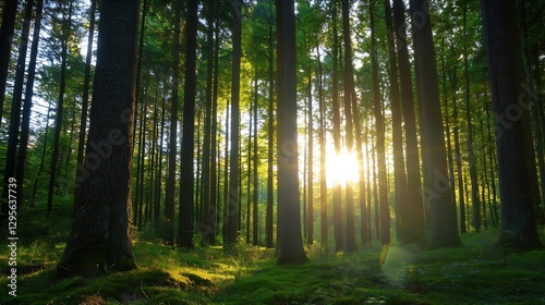 Obraz premium Sunlight Filtering Through Tall Trees in a Lush Green Forest Creating an...