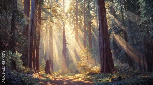 Fototapeta premium Sunlight Filtering Through Tall Trees in a Redwood Forest