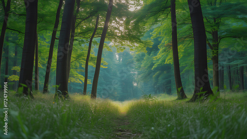 Obraz premium Sunlight filtering through tall trees in a serene forest with a grassy path...