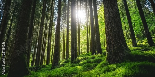 © MinimalZine, Fototapeta premium Sunlight Filtering Through Tall Trees in Lush Green Forest