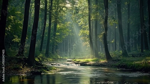 Obraz premium Sunlight Filtering Through Tall Trees onto a Stream