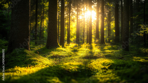Fototapeta premium Sunlight filtering through tall trees over a mossy forest floor at dawn inspires a peaceful outdoor atmosphere