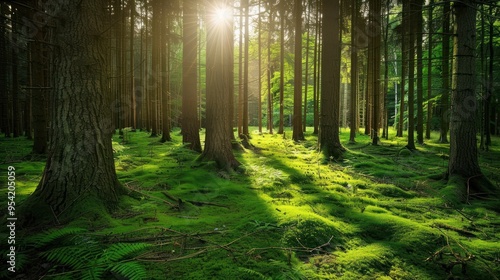 Naklejka premium Sunlight Filtering Through the Forest Canopy