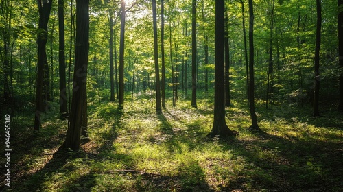 © Napasnan, Obraz premium Sunlight filtering through the leaves of a dense forest, casting shadows on the forest floor