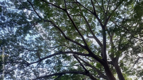 Obraz premium Sunlight filtering through the lush canopy of a large, mature tree in a...