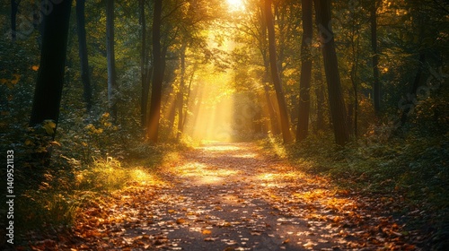 Fototapeta premium Sunlight filtering through the trees in an autumn forest trail path