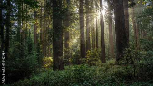 © The 2R Artificiality, Obraz premium Sunlight filtering through towering ancient trees at dawn