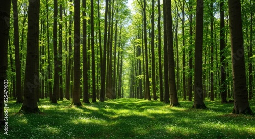 © Candra, Fototapeta premium Sunlight Filtering Through Towering Trees in Lush Green Forest.