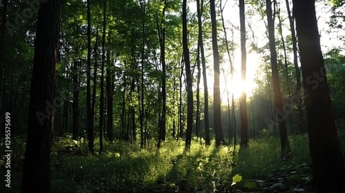 Obraz premium Sunlight filtering through tree trunks in a dense forest creating a beautiful...