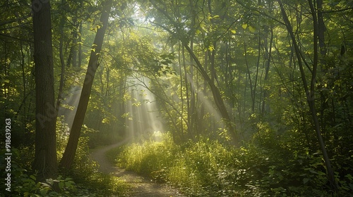 Fototapeta premium Sunlight filtering through trees along a winding path in a serene forest...
