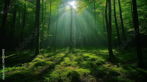 © Jaruwan, Naklejka premium Sunlight Filtering Through Trees in a Lush Forest