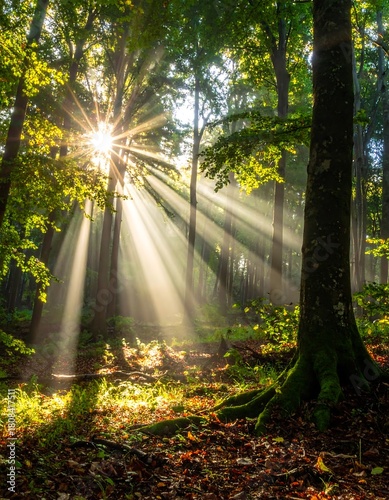 © Fais, Fototapeta premium Sunlight Filtering Through Trees in a Lush Forest Landscape.