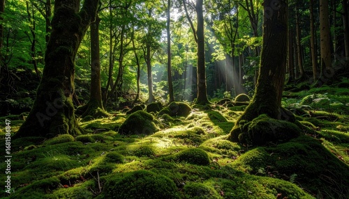 © Sarinrata, Obraz premium Sunlight Filtering Through Trees in a Lush Green Forest Scene