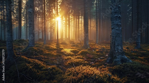 Obraz premium Sunlight filtering through trees in a serene forest during early morning,...