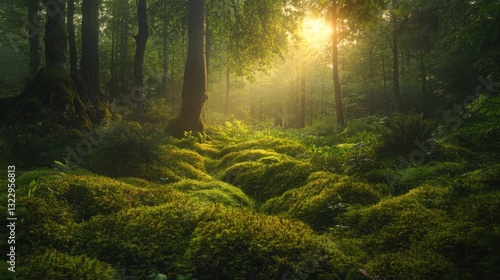 © Anu, Obraz premium Sunlight Filtering Through Trees in a Serene Forest Landscape