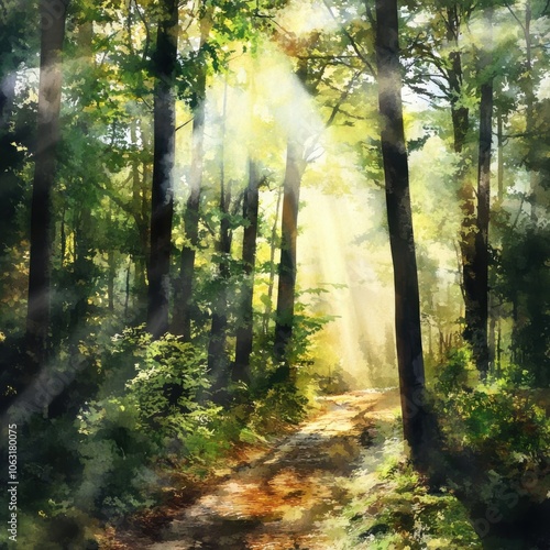 © Katavudh, Obraz premium Sunlight filtering through trees in a vibrant forest landscape