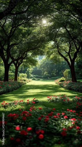 Obraz premium Sunlight Filtering Through Trees In Garden Path