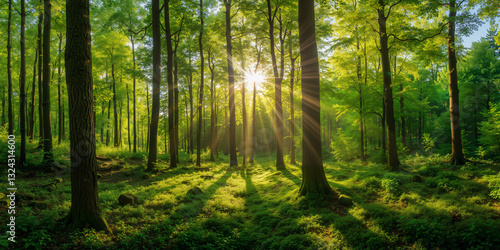 © Hassan, Fototapeta premium Sunlight Filtering Through Trees in Lush Green Forest