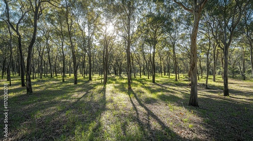 Fototapeta premium Sunlight Filtering Through Trees in Lush Green Forest Landscape