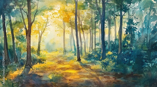 © vadosloginov, Obraz premium Sunlight filtering through trees on a serene forest path