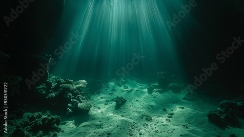 Obraz premium Sunlight filtering through water over a tranquil coral reef in the ocean at noon