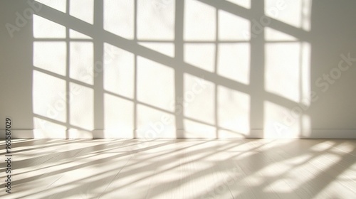 © Anna, Fototapeta premium Sunlight Filtering Through Window Casting Shadows on White Wall and Wooden Floor.